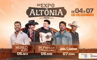 Detalhes do evento Data: 05 de dezembro de 2025 Local: Sociedade Rural de Altônia – Altônia, PR Abertura dos portões: 19h30 Abertura da bilheteria: 19h30 Atração: Murilo Huff Cronograma/ordem/horário das apresentações será divulgado em breve nas redes sociais oficiais. Classific